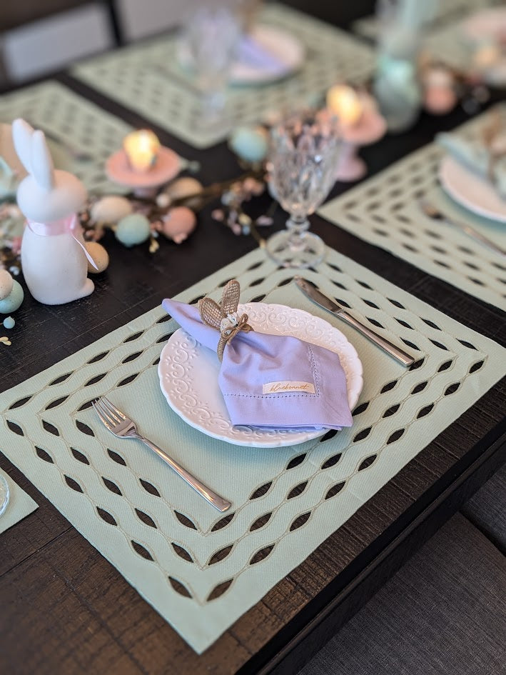 Tablet Setting Kit: A table setting kit includes one charger plate cover (or one placemat), one matching napkin and one napkin ring. If you have 4 people in your family, you should buy 4 kits. One for each person.