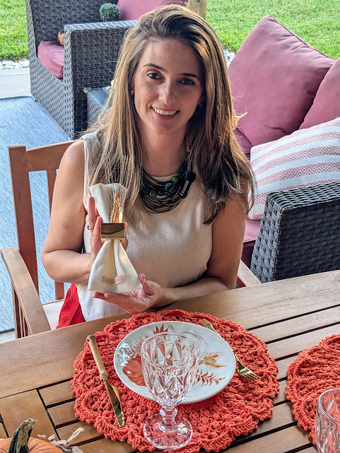 Set with one crochet placemat, one matching napkin and one napkin ring.